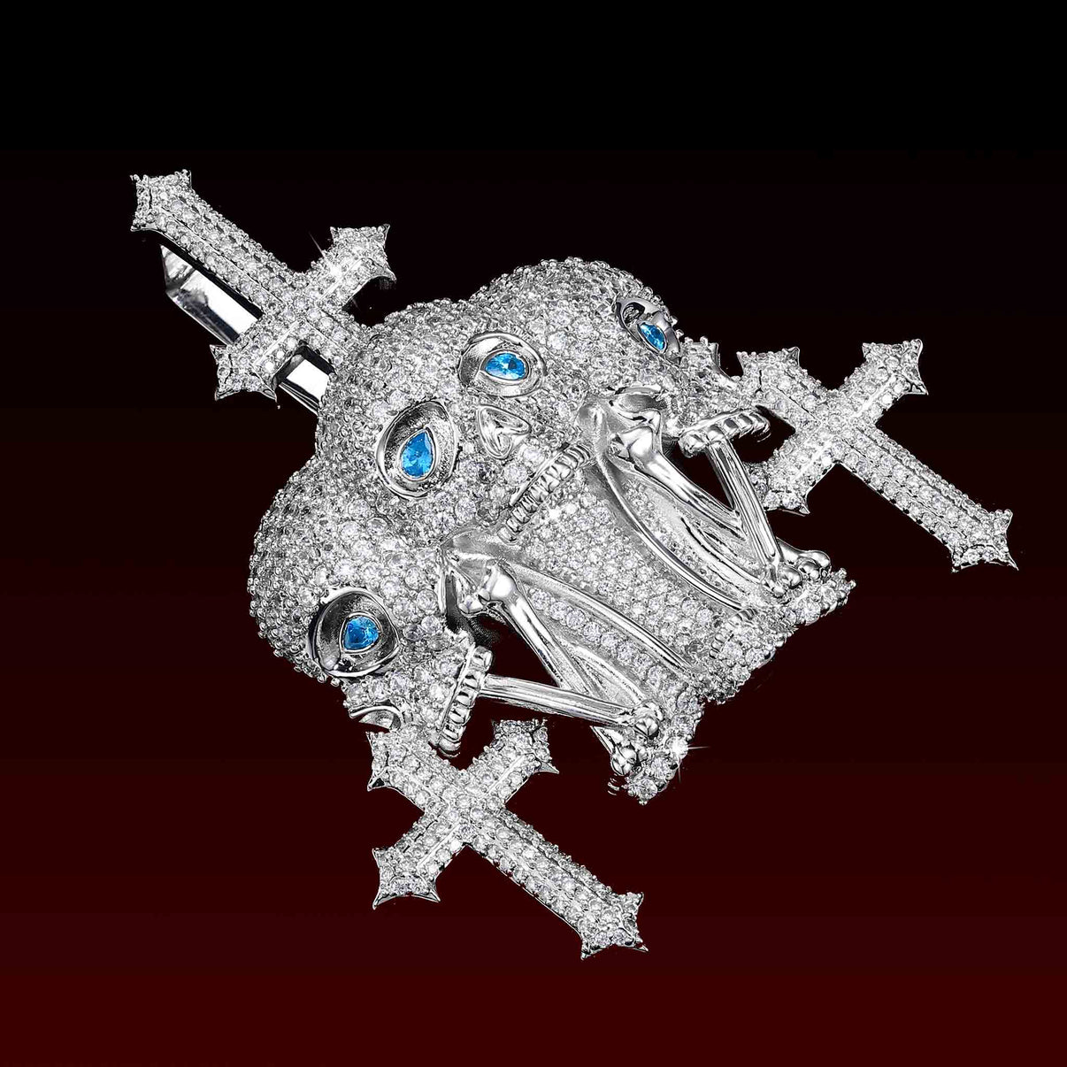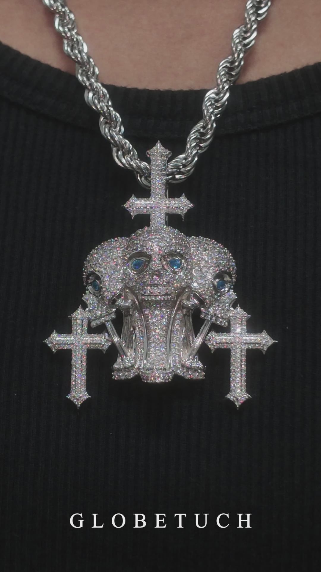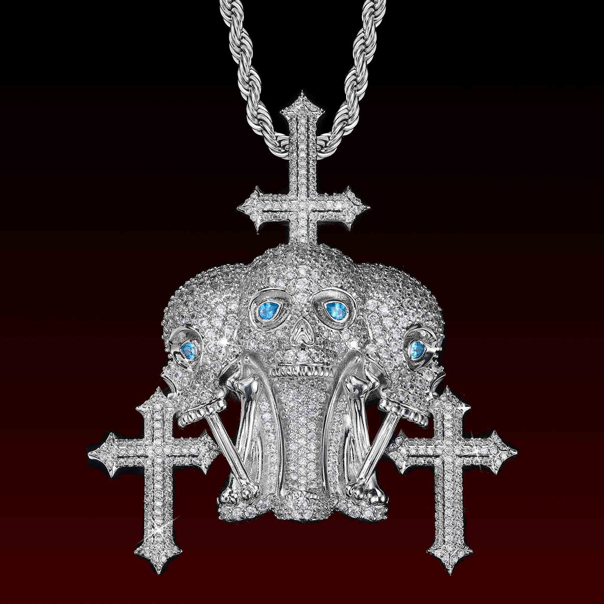 Turn heads with the Crossed Skull Iced Out Pendant, a bold design combining 3 skulls and 3 crosses for the ultimate dark street vibe. Fully iced with sparkling stones, this pendant embodies rebellion, individuality, and raw hip hop energy.