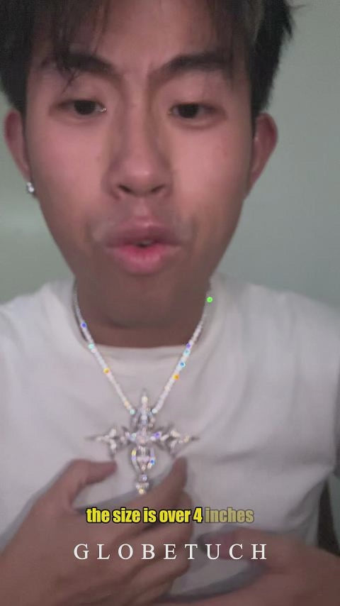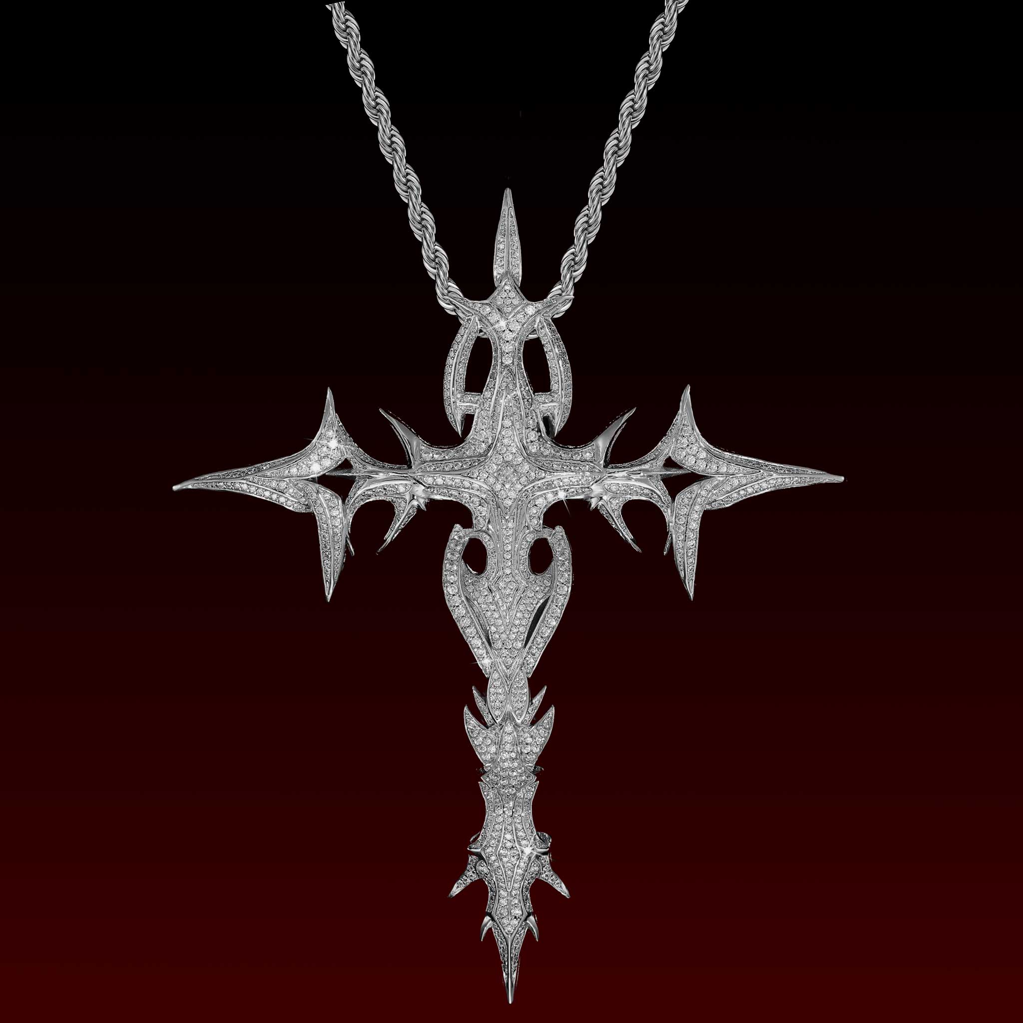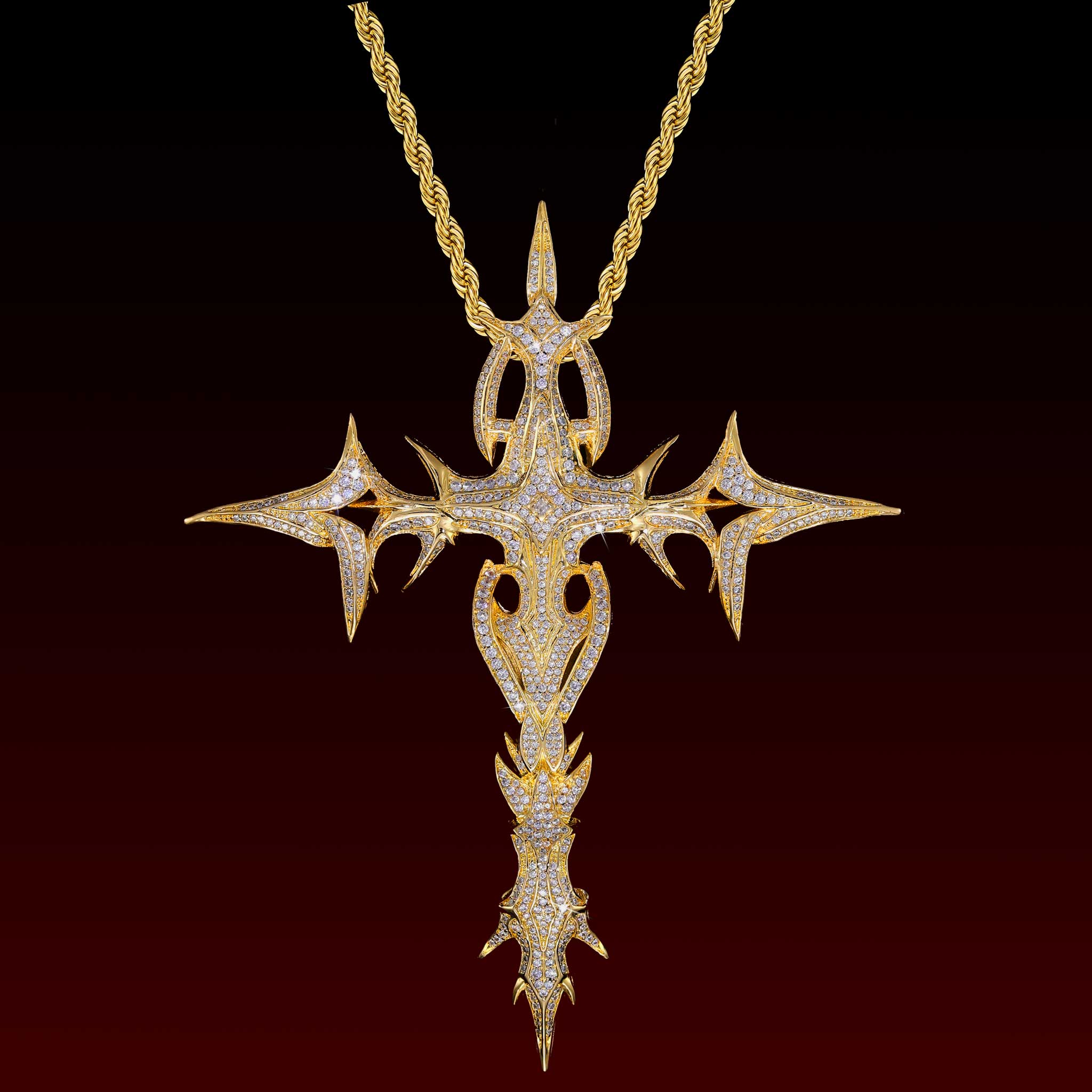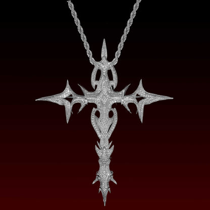 Reversible rightside-down cross pendant featuring a fully iced-out side with VVS simulated CZ Stone and a sandblasted gothic flame design on the reverse. Crafted for hip hop, streetwear, and gothic fashion lovers seeking a versatile statement necklace with luxury style and bold personality.